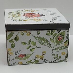 A wooden hinged box featuring watercolor artwork, "Good Luck Vibes" top lid sentiment, and ladybug and flower designs. Complements well with coordinating pieces in collection for a refreshing spring display. Makes a great little box for putting small items insides such as ear pods, earrings, rings.