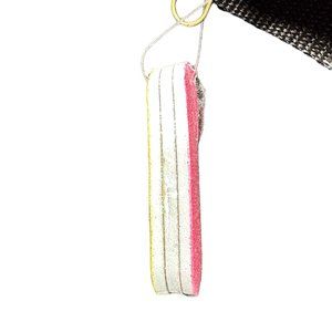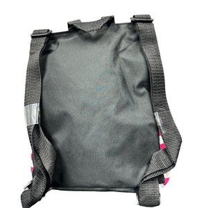 This small Primrose Hill London Elephant Backpack Purse features hot pink and white stripes with a bowtie wearing elephant. It has black straps and back with a small top handle with one main zippered compartment. Three small glittery emery boards are included.