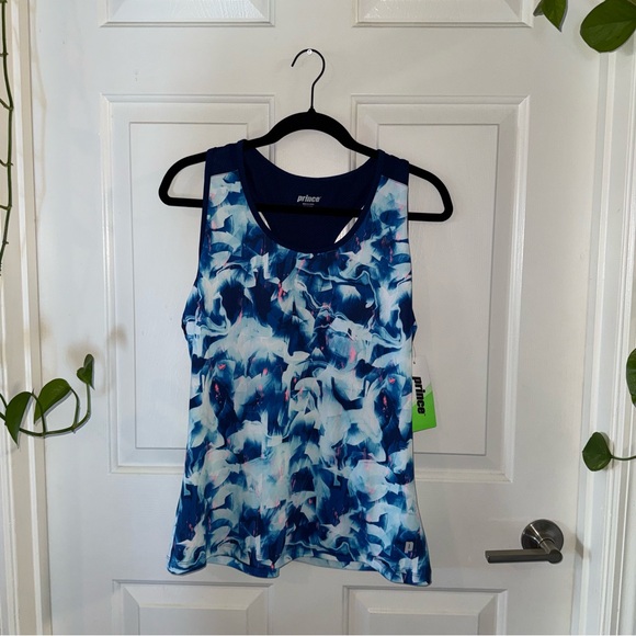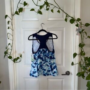 Sleeveless athletic tank with bold blue abstract print. Racerback styling for freedom of movement. Lightweight, breathable fabric for workouts. Sporty look pairs well with leggings or shorts.