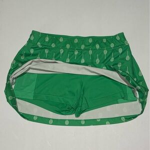 Prince Conversational Tennis Skort, Emerald Green, Biker Shorts underneath with side pockets, elastic waistband, Tennis Racquet Print