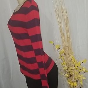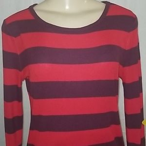 This long sleeved striped top looks great with dark or light color jeans. Very comfortable and fitted. Fits like a large but it does stretch