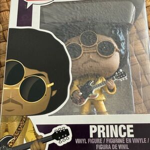 Funko Pop vinyl figurine of Prince wearing a gold suit and holding a guitar. Brand new in box.