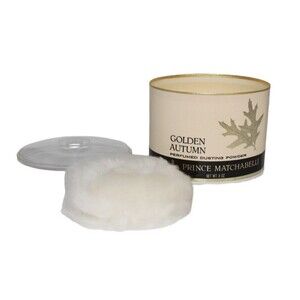 Collectible Prince Matchabelli Golden Autumn perfumed dusting powder. NOS New in box. Talc is sealed. 8 1/2 oz. Wear to box. The puff is cean and unused. The dark spots are shadows