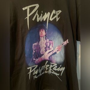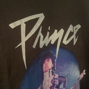 Black graphic t-shirt featuring Prince and Purple Rain design.