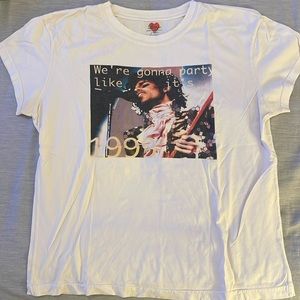 Short-sleeve t-shirt with a Prince graphic. Shirt is a pale purple / lilac color and made of a thin soft material. Labeled as a large but it fits like a small. Slightly cropped length.
