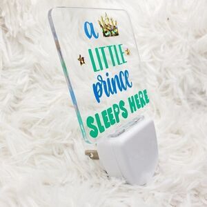 Are you expecting a new prince or princess in your life? Or maybe you already have a prince or princess. Do they need a light extra light in their room at night. Do you need a way to see them when you enter a dark room. This perfect plug in night light is everyone's dream. There are two available options. Option one: A little prince sleeps here, The letterings are blue and green accompanied by a gold crown and stars. Option 2: A little princess sleeps here, The letterings are a bright pink and purple accompanied by a gold crown and stars. This is the perfect amount of light for your little ones room.
