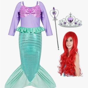 Enchanting mermaid costume set featuring a purple and green dress, red wig, and matching accessories. Perfect for dress-up and themed parties.