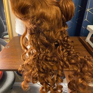 Worn about ten times as a party princess. It is a hard front wig with several built in clips in the front and back for stability. Wig is is great condition, I just don’t do this job anymore. It is an auburn/brown wig, that was styled to replicate the Disney parks Belle wigs.