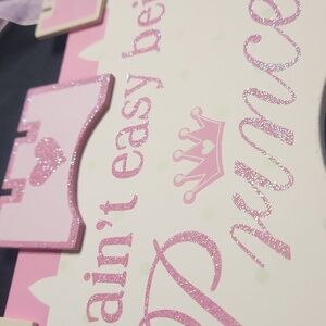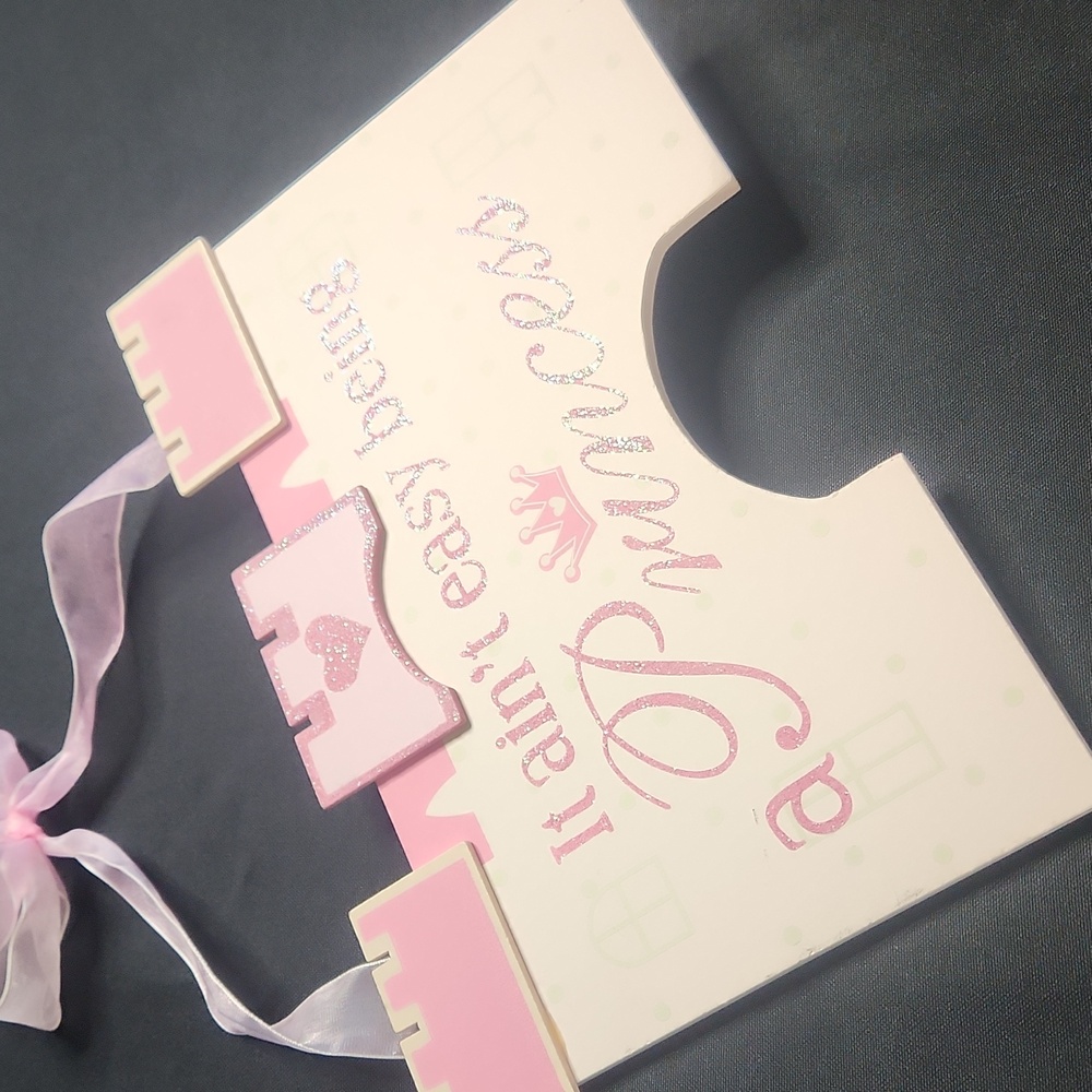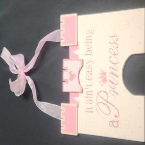 Adorn your child's room with this charming pink princess castle door or wall sign. Perfect for adding a touch of magic to any space. Glitter lettering and sheer ribbon hanger.