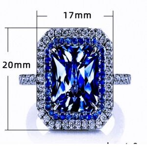 Princess Cut Blue Sapphire & White Baguette Diamond Ring on 925 Sterling Silver