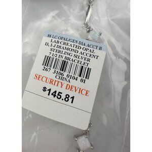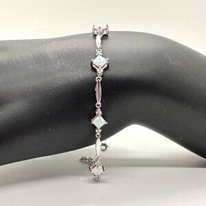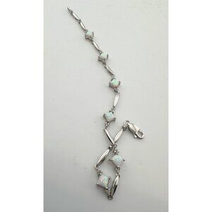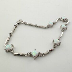 Petite and subtle but beautiful shine in gemstones to stand out. 6 perfect princess cut opals (lab created ). Small natural diamond accent. Sterling Silver (.925). Hangs nicely on the wrist, good size to add shimmer but not be too much. Beautiful Bracelet.
