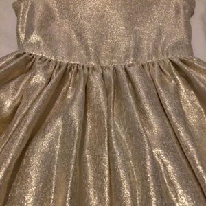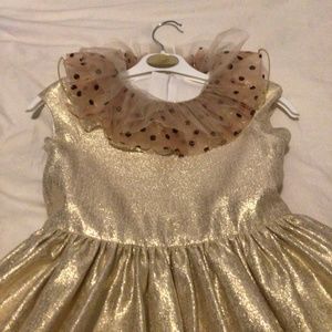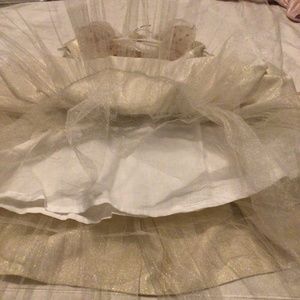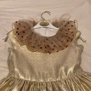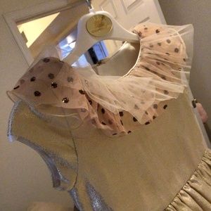 Princess Golden Occasion Dress, European dress, amazing quality, shimmery golden bodice and full skirt, two layers of champagne colored crinoline under the skirt layer, and a comfortable cotton lining. Tiny cap sleeves, and a beautiful multi layered ruffle at the neck. Under layer has a ruffle, middle layer has golden shimmer polka dots, top layer in champagne tulle. Worn once.