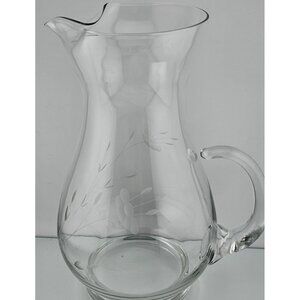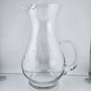 Add a vintage touch to your serving collection with this Princess House crystal pitcher. The elegant clear glass is etched with a cornflower flower pattern and has been a popular classic design. This pitcher will blend beautifully with a minimalist theme kitchen as well as a cottagecore tablescape.
