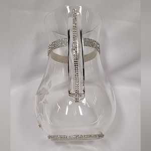 Clear pitcher with etched flowers, hummingbird, and silver rhinestones. 8"H, 7.5"W with handle