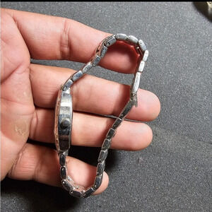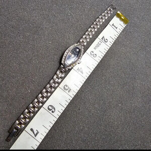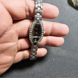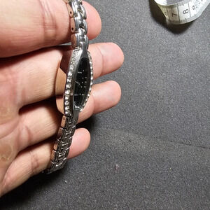 Princess Ladies Quartz Watch Silver Tone Diamond Bezel Black Dial Working shows signs of wear such as scratches on case band and crystal see pictures for reference