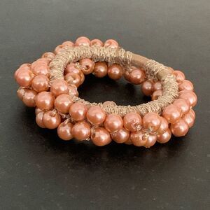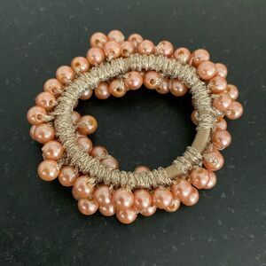 TAGS: pink pearl hair tie, blush children’s hair band, gold elastic ponytail holder, flower girl accessory, boutique hair bracelet