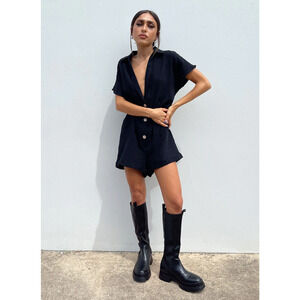 Princess Polly 6 Black Deep V-Neck Collared Short Sleeve Button Up Romper