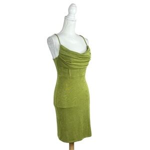 The dress features a figure-hugging bodycon silhouette that accentuates your curves, creating a flattering and confident look. The Retro Green color adds a playful and nostalgic touch, reminiscent of vintage aesthetics while maintaining a modern edge. No rips, stains or pulls. Delicate material wear with care.