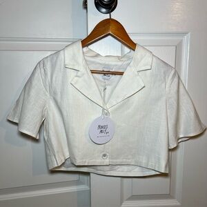 Princess Polly Addison Button Up Cropped Collared Top, Short Sleeve, White, Women's Size 6. Linen Blend, NWT