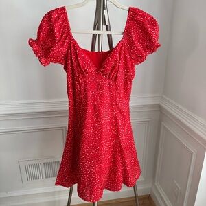 Flattering fit design dress, size 2, like new condition. Red floral print, Short elasticated and ruffled sleeves, V neckline. Invisible back zip and fully lined.