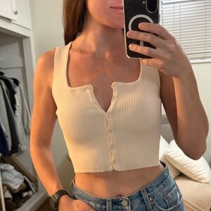 Stylish beige ribbed crop top with button-up front. Ideal for casual or evening wear.