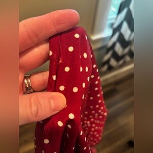 Stylish burgundy mini dress with white polka dots. Features a fitted silhouette and ruffle hem. Perfect for casual events.