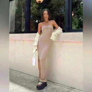Key words: strapless, maxi dress, neutral dress, lightweight, casual, cocktail dress