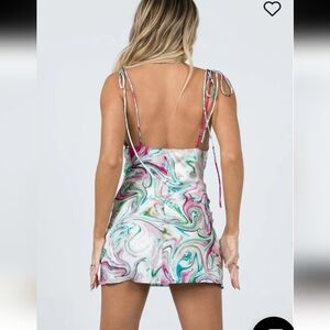 Slinky silky slip dress from Princess Polly in white silky material with a touch of spandex, no stretch, white with pink, fuscia and green marble swirl, side hidden zip closure. Adjustable tie straps, cowl neck, mini length, fully lined. New with tags.