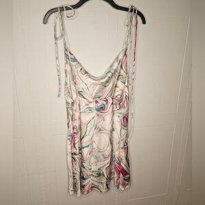 Slinky silky slip dress from Princess Polly in white silky material with a touch of spandex, no stretch, white with pink, fuscia and green marble swirl, side hidden zip closure. Adjustable tie straps, cowl neck, mini length, fully lined. New with tags.
