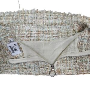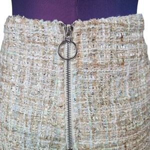 Features textured tweed fabric with raw hem, edgy exposed back zipper with gold circle pull, pastel aqua with cream and gold sequins, high waisted mini skirt, fully lined, preppy school girl style.