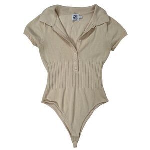 Princess Polly Cream Ribbed Knit Short Sleeve Collared Button Down Bodysuit / XS