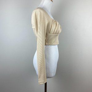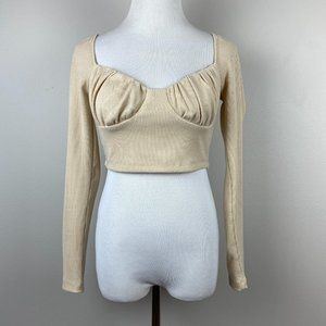 Princess Polly Crop Top 6 Beige Ribbed Knit Sweetheart Neckline Long Sleeve Ruched Women's