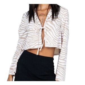 Sold out online! Princess Polly Cropped Linen Long Sleeve Top in fun and trendy animal print. This white and beige / camel striped top featured front-ties, long-flared sleeves and a flattering crop. Can be worn as shirt or a light jacket over a tank. You’re sure to receive plenty of compliments with this one! Perfect pre-owned condition. Women’s size 6.
