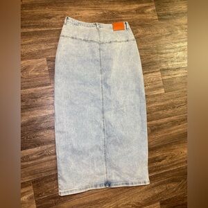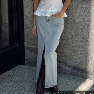 Stylish light wash denim maxi skirt. Features a classic straight cut. Perfect for casual outings.