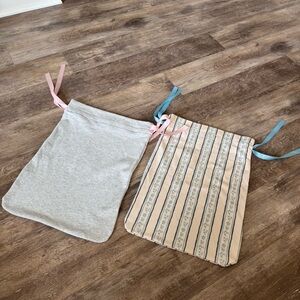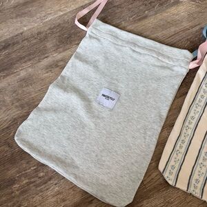 Set of two Princess Polly drawstring bags. One is gray with pink ties. The other is cream with blue stripes and ties.