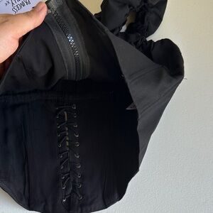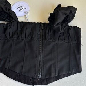 Chic black bustier with lace-up detail. Features gathered off-shoulder sleeves.