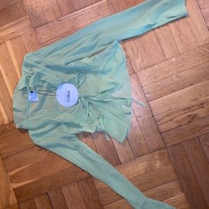 Never Worn, just received from package. Tags included. Not needed Anymore. Long sleeve top 100% polyester Sheer material Frill neckline & hem Tie fastening at bust Flared sleeves Non stretch Unlined