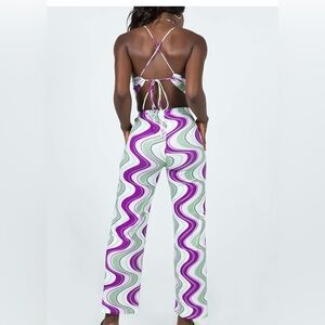 Vibrant skirt with a dynamic swirl pattern. Features bold purple and green hues.