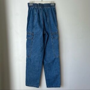Princess Polly High Rise Paperbag Waist Cargo Style Jeans 2. Cargo jeans. Relaxed fit. 100% cotton. Dark wash denim. Zip & button fastening. Classic five pockets. Button pockets on legs. Belt looped waist. Tapered leg. Paperbag elastic waist. Non-stretch. Princess polly tag has been removed. Waist is 12.5" across, rise 13.5", inseam 28".