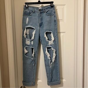 light blue, highly distressed high-waisted mom jeans from Princess Polly. in great condition, with no flaws! jeans are a slightly lighter blue than what is appearing in photos.