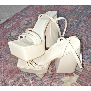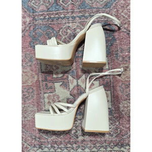 Princess Polly, La Belle heels, white platform heels, bone block heel, women’s size 5, platform sandals, strappy block heels, statement footwear, faux leather heels, night out shoes, bridal heels, fashion Instagram shoes
