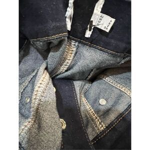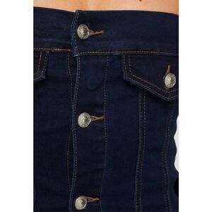 Button fastening down front, twin faux chest pockets, raw edge hem