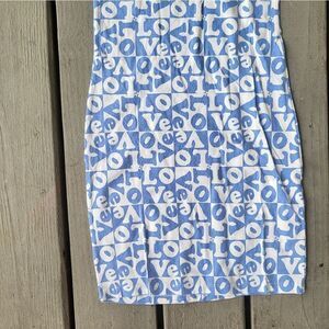 This Princess Polly dress features a blue color with a checkered pattern and the letters for “Love” spread out on each square, short sleeves, a collar that opens to a slight v-neck, and a mini hem.