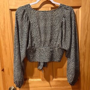 Questions in comments. Measurements in pictures. This Princess Polly New Mood cropped tie front is a must have for any wardrobe. It is Chic and stylish black with spotted print cropped top. Long balloon sleeves. Functional tie front. Deep v-neck. Good condition size 6