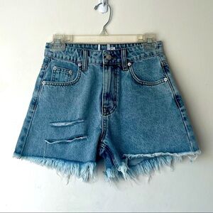 Princess Polly On Tour Distressed Denim High Waist Mom Shorts 2. Denim shorts. High waisted fit. Classic 5 pocket design. Zip & button fastening.Cotton. Princess polly tag has been removed. Slash style distressing on front leg, and one under the butt pocket. raw frayed unfinished hem. waist is 13" across, rise 11", inseam 4"