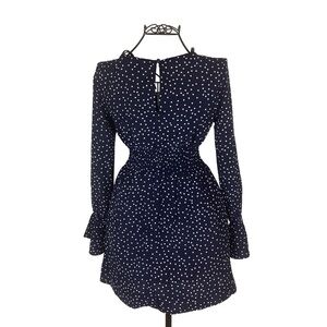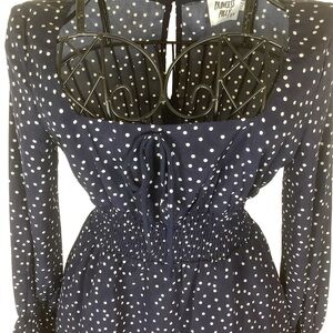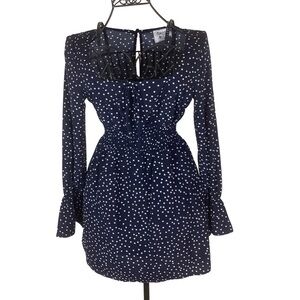 This adorable Princess Polly dress is the perfect mix of flirty and feminine. Featuring a navy blue base with white polka dots, this long sleeve mini dress has a flattering square neckline, tie front detail, and stretchy smocked waist that cinches you in just right. The flared cuffs add a fun, retro-inspired touch.