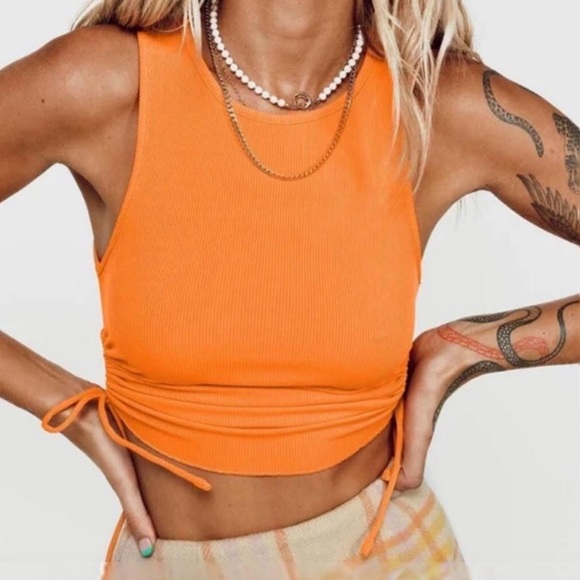 Elevate your style with this vibrant orange tank top from Princess Polly, featuring a sleeveless design and a flattering ruched, fitted silhouette. The cropped length adds a trendy touch, making it perfect for pairing with high-waisted bottoms. Its striking tangerine hue ensures you'll stand out in any crowd. adjustable ties on both sides.