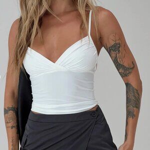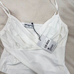 Brand new with tags Princess Polly Sampson Top in crisp white. This slim-fitting top features adjustable shoulder straps, a flattering V-neckline, and ruched bust for a chic, flattering fit. Crafted from a stretchable blend of reclaimed nylon and elastane, it offers comfort and style.