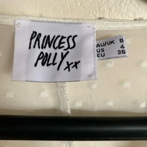 Princess Polly Chic sheer blouse with dot pattern. Features long sleeves and ruffle hem. Ideal for stylish outings. Size 4