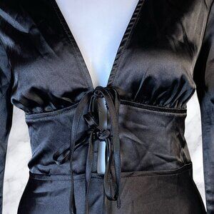 Plunging neckline, twin tie fastening at bust, flared cuff